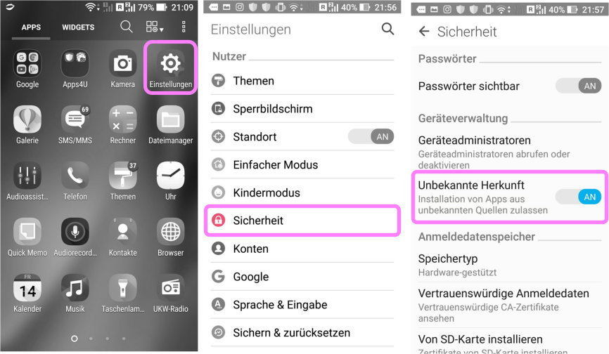 Wenn Ihr Handy das Herunterladen der App nicht zulässt, müssen Sie die Sicherheitseinstellungen ändern (siehe Bildschirmkopie). mobile-security-settings